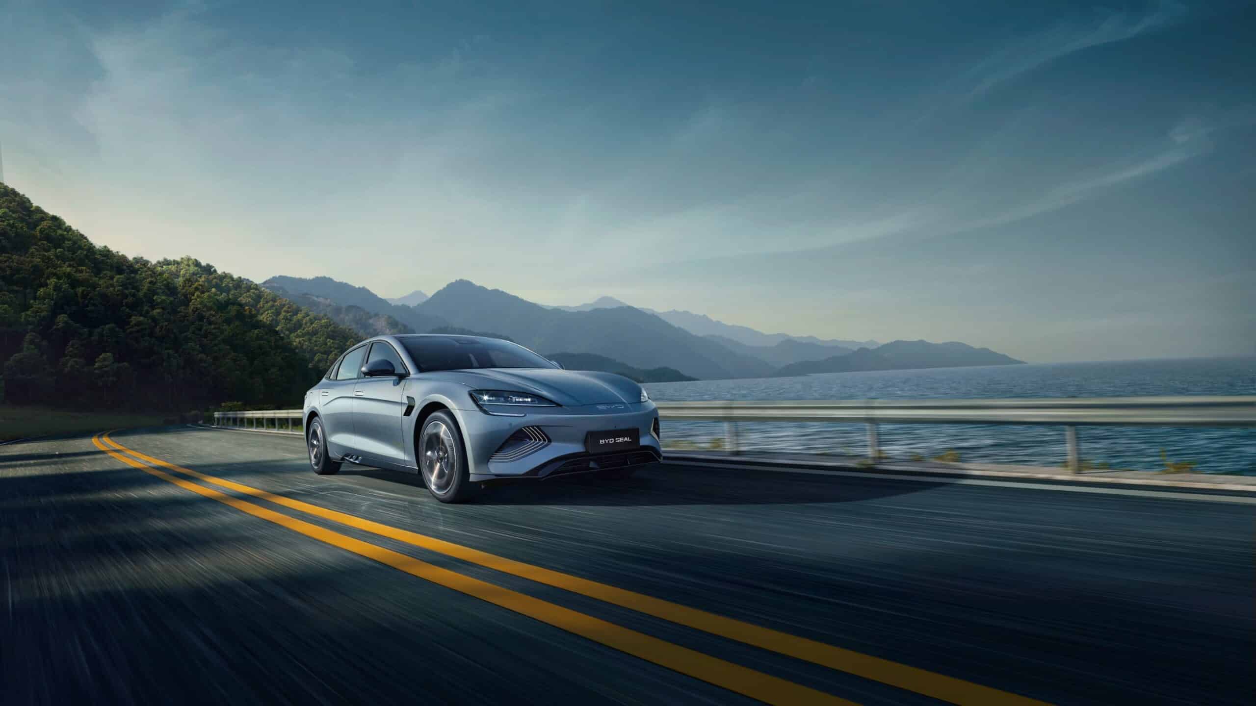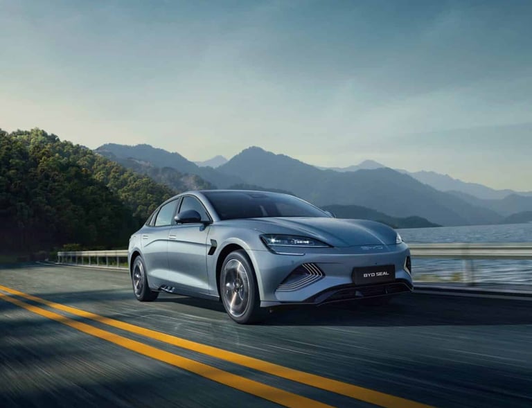 BYD Seal desain sporty-futuristik, bodi coupe ramping, lampu LED tipis, interior modern dengan layar besar & material premium.
