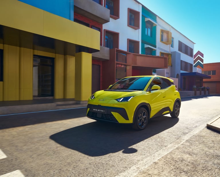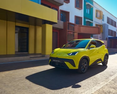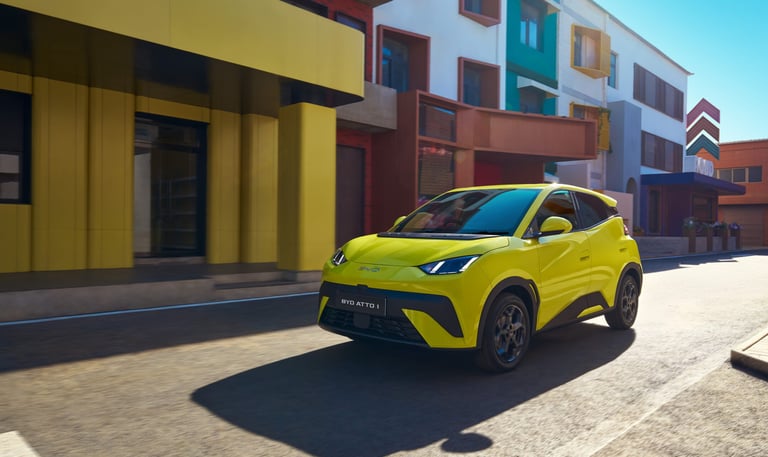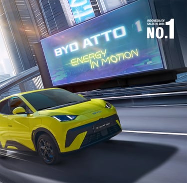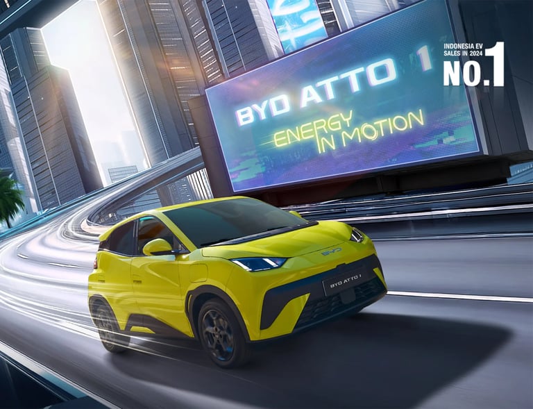 BYD Atto 1 tampil menarik dengan desain kompak, garis bodi dinamis, lampu LED modern, serta interior simpel namun stylish dengan layar sentuh besar dan nuansa futuristik.